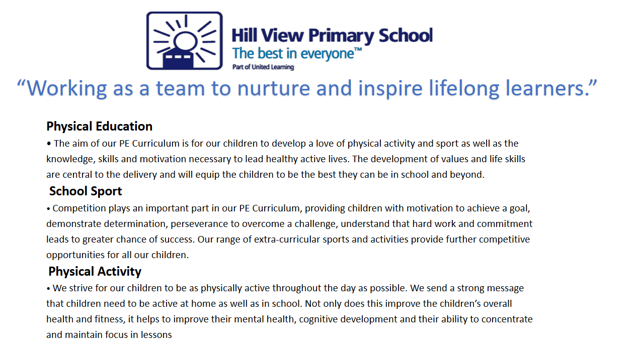 Our balance of individual, team, cooperative, competitive, and creative activities caters for individual pupils needs and abilities. The PE scheme of work progressively builds key knowledge, skills, and techniques, which, combined with varied and flexible teaching styles provides stimulating, challenging and enjoyable learning opportunities for pupils. We base our learning on Complete PE. Complete PE has a clear pathway from FSR to year 6. In EYFS, the pupils learn basic fundamental movement skills. In Key Stage One the pupils develop their motor and fundamental movement skills ready for transition to Key Stage Two. They learn how to move in different ways, throw, catch and working as a team. In KS2, they use their previous knowledge and use the skills they've learnt and use them in a variety of sports. They also learn the rules, tactics, and strategies of a variety of sports and what skills are needed to perform well in them. During PE lessons, children will learn skills that will help them with everyday life, such as gratitude, respect, teamwork, communication, and problem solving, to name a few. Sport is a fantastic way not just to develop young people’s physical skills but to set them up with skills that will help them with their journey through life. All children receive two hours of physical education a week. These lessons are delivered either by the class teacher or a specialist PE coach. We have purchased the Complete PE programme of planning, which covers all of the lessons that are taught.